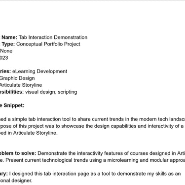 This conceptual project showcases my design skills using Articulate Storyline 360. It features a simple tab interaction, demonstrating how Storyline can present information in an engaging way beyond traditional bullet points.